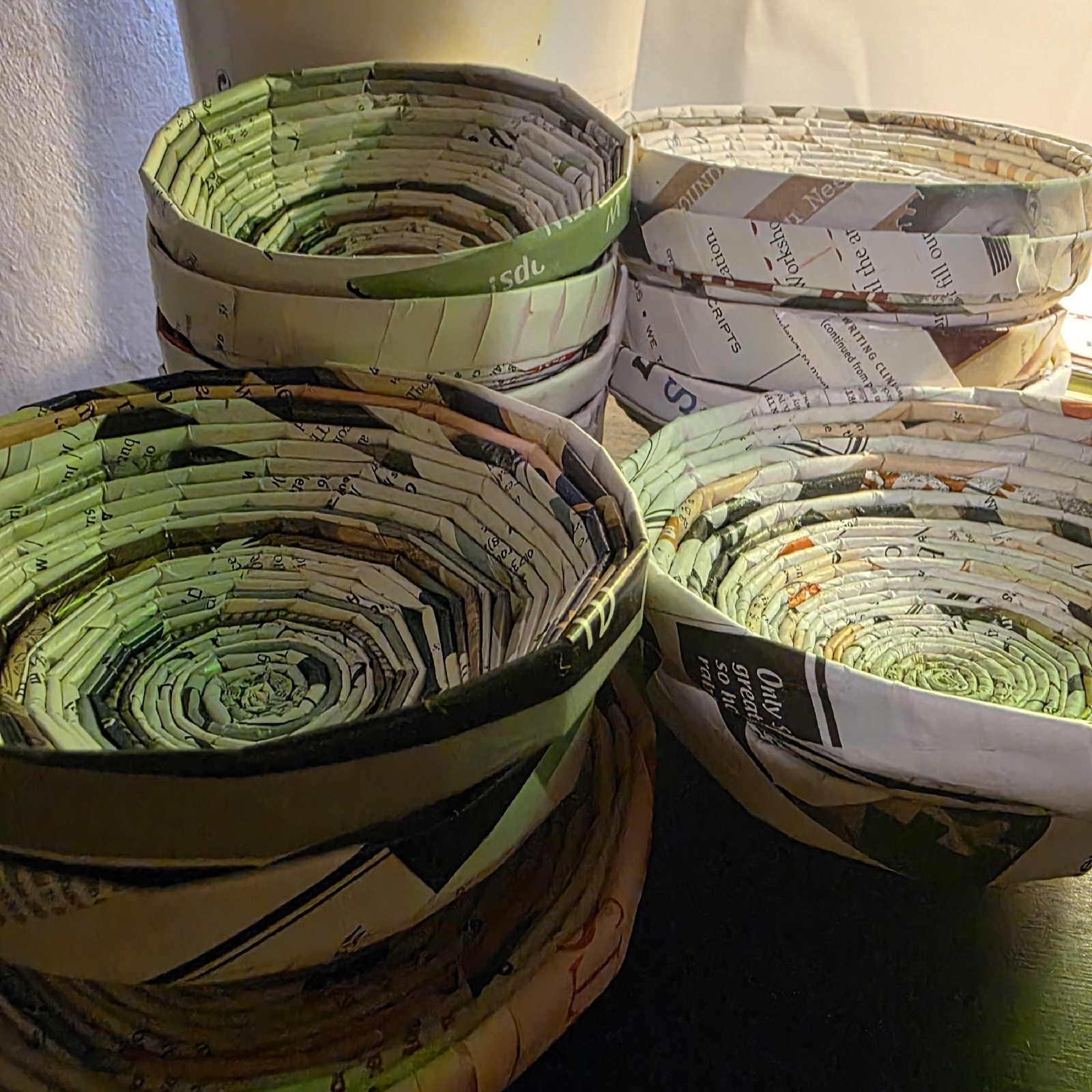 Each magazine is taken apart, rolled, flattened, glued, and spiraled into a wonky bowl shapes. The first two I made when I was quite sick. I was so weak I could not hold the spiral together as I was making them. It took me several tries to secure the spirals without having them sproing apart on me. I had to leave off the project entirely until I regained my strength.